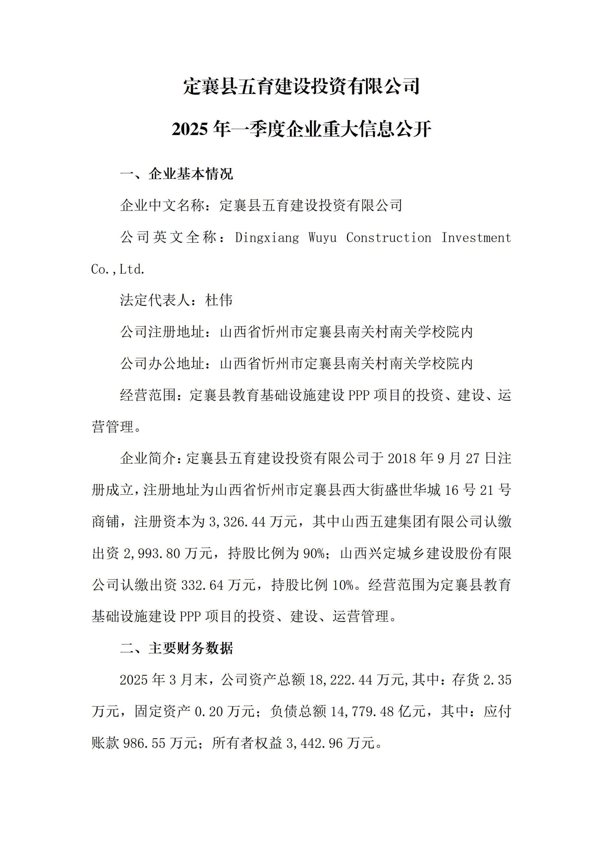 定襄县五育建设投资有限公司2025年一季度企业重大信息果真
