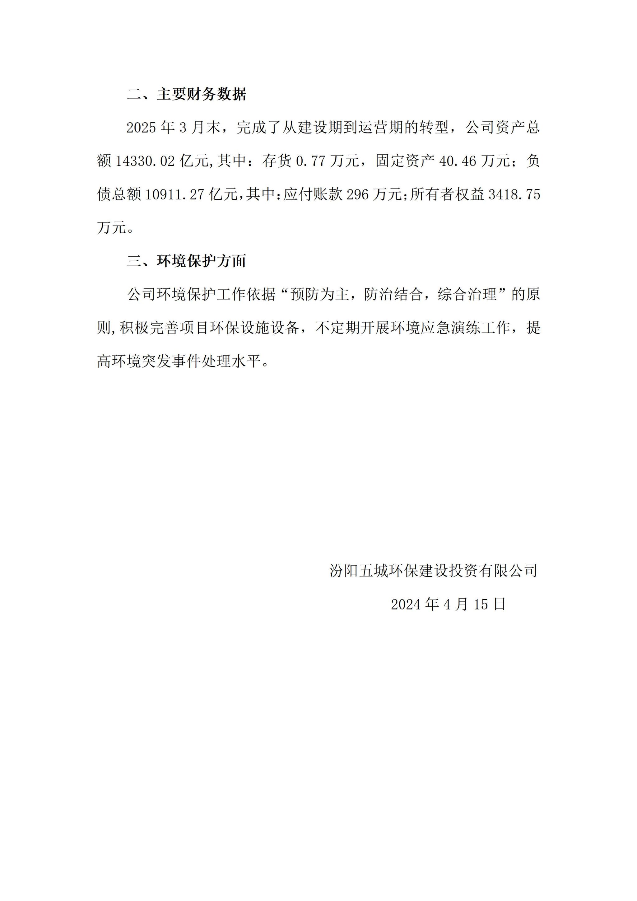 汾阳五城环保建设投资有限公司2025年一季度企业重大信息果真