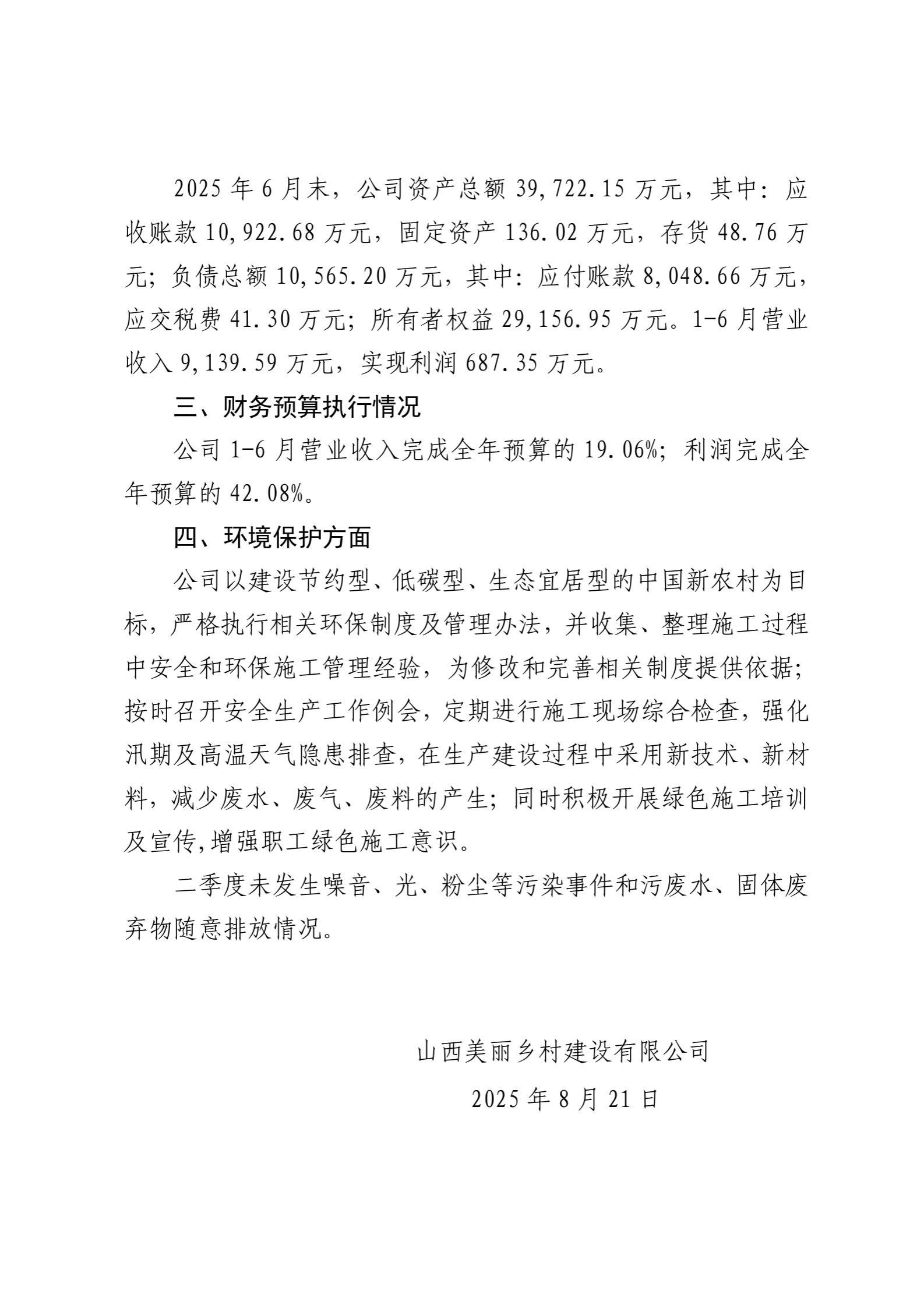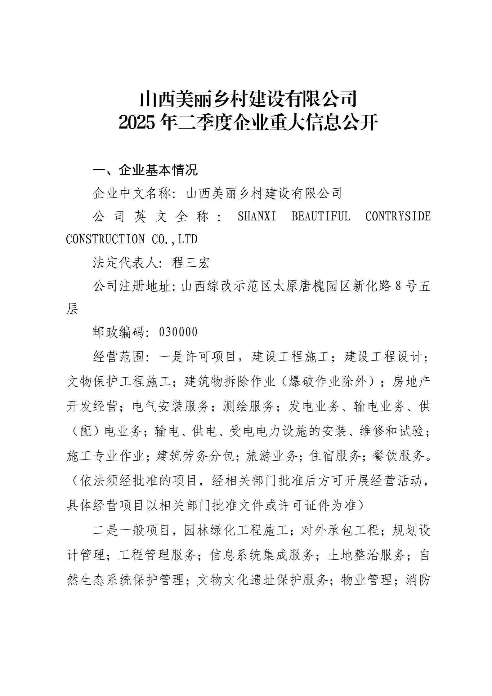山西漂亮墟落建设有限公司2025年二季度企业重大信息果真