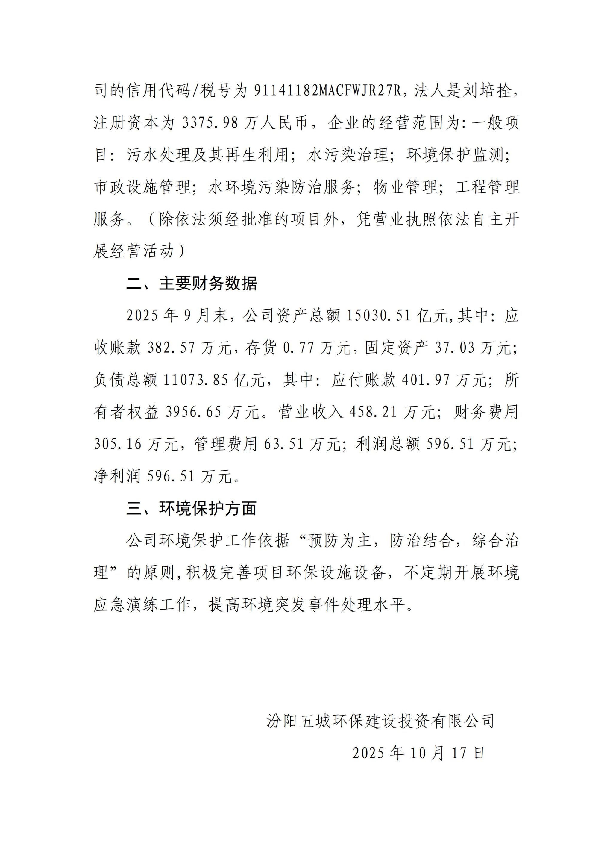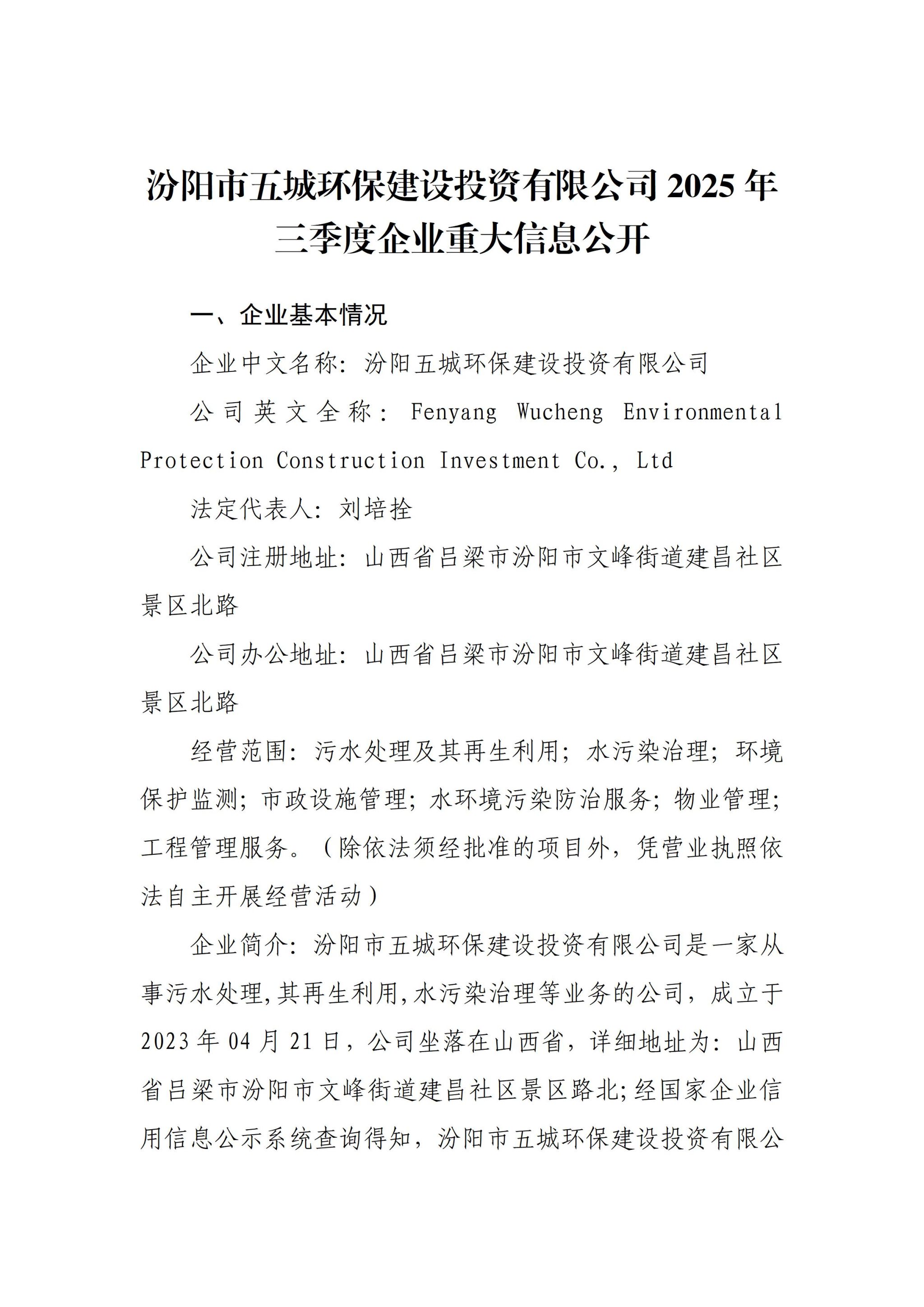 汾阳五城环保建设投资有限公司2025年三季度企业重大信息果真
