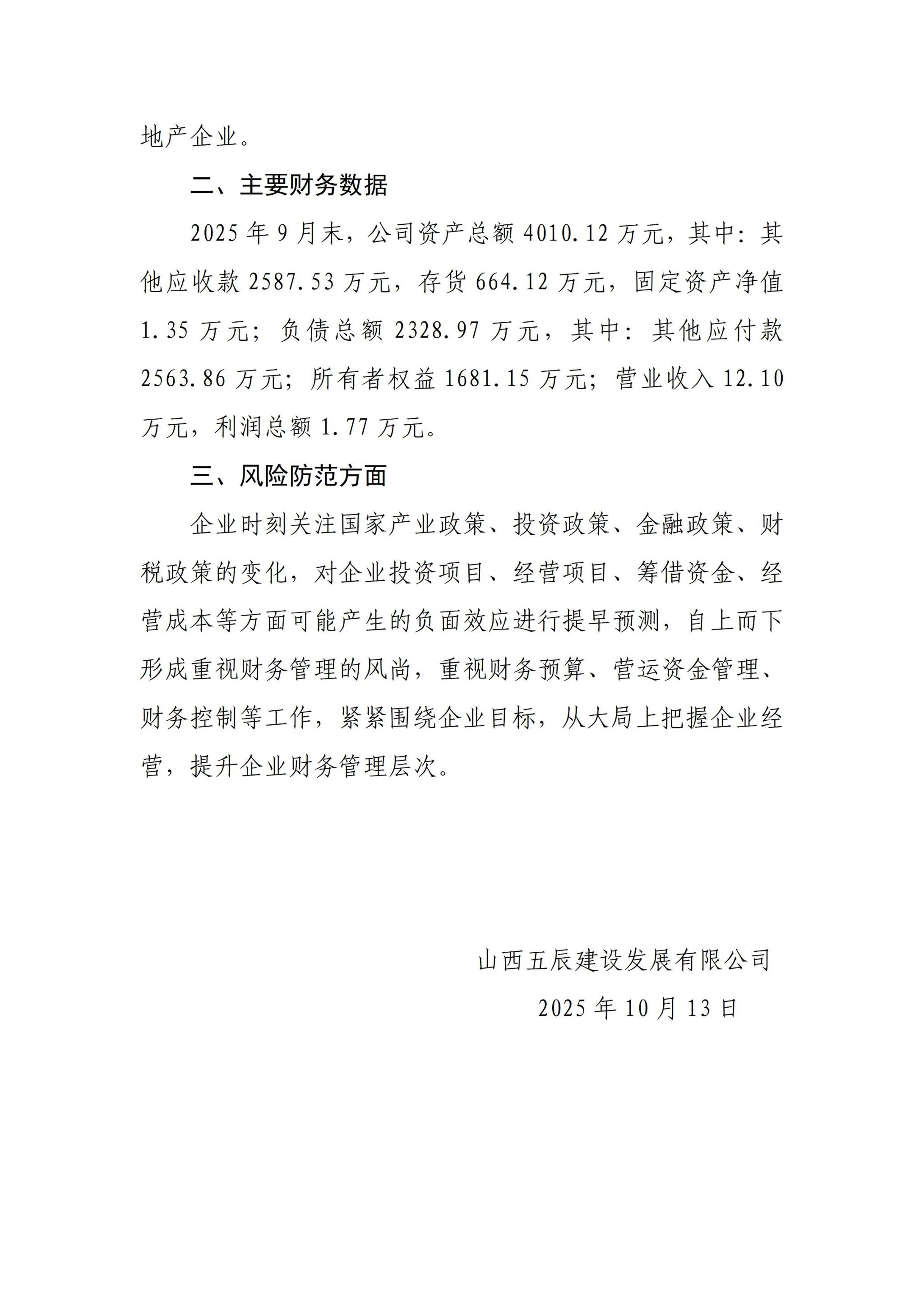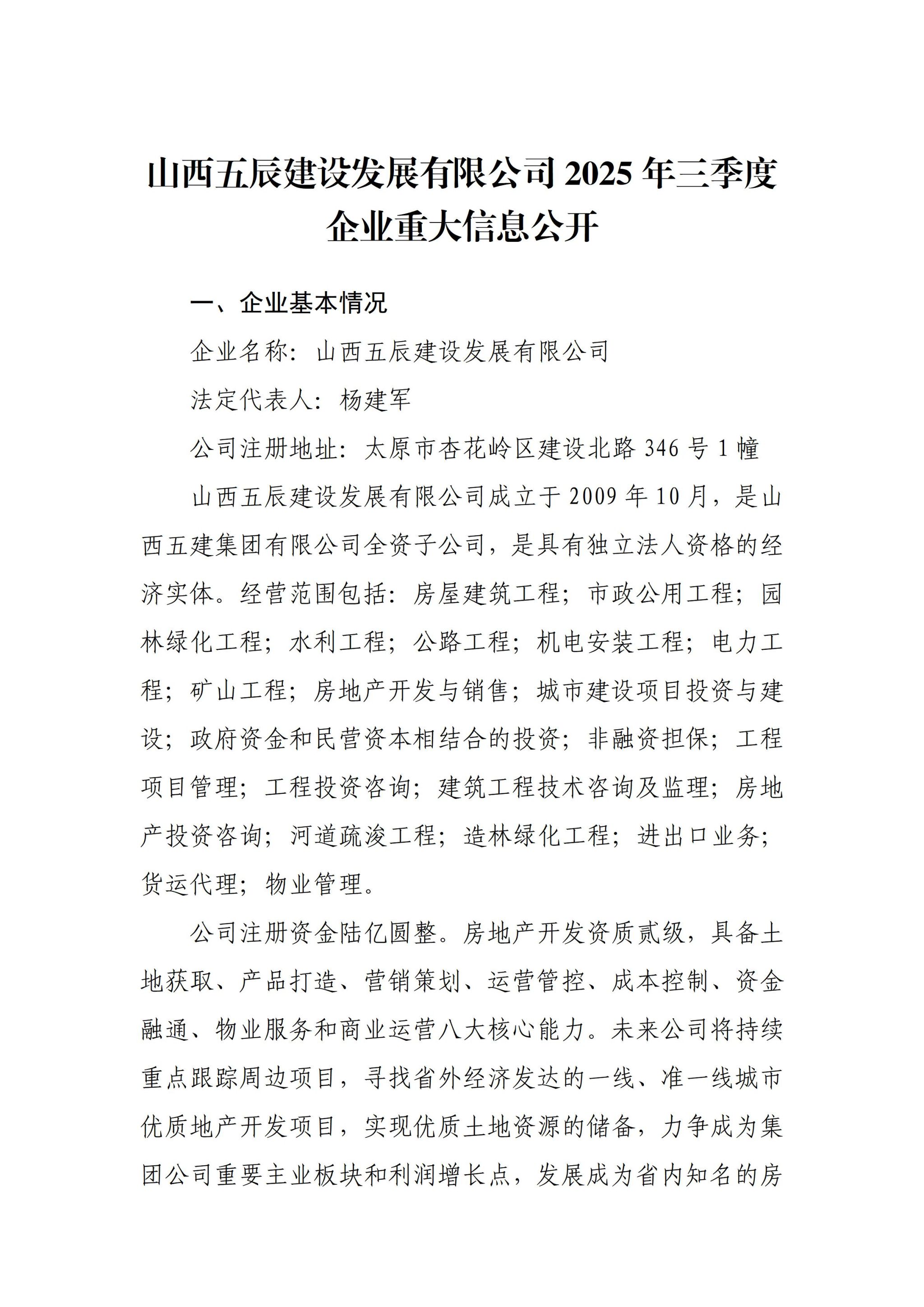 山西五辰建设生长有限公司2025年三季度企业重大信息果真