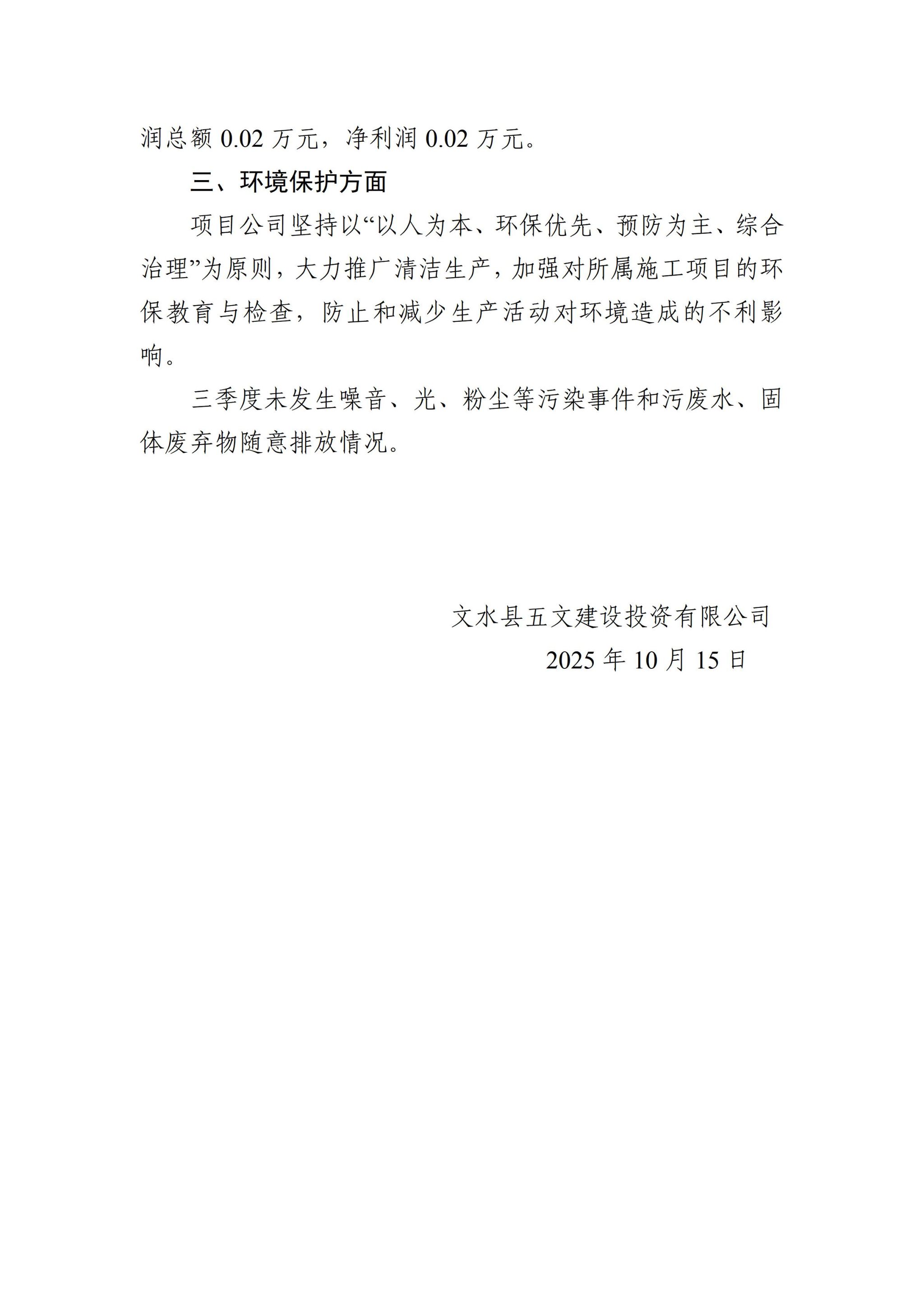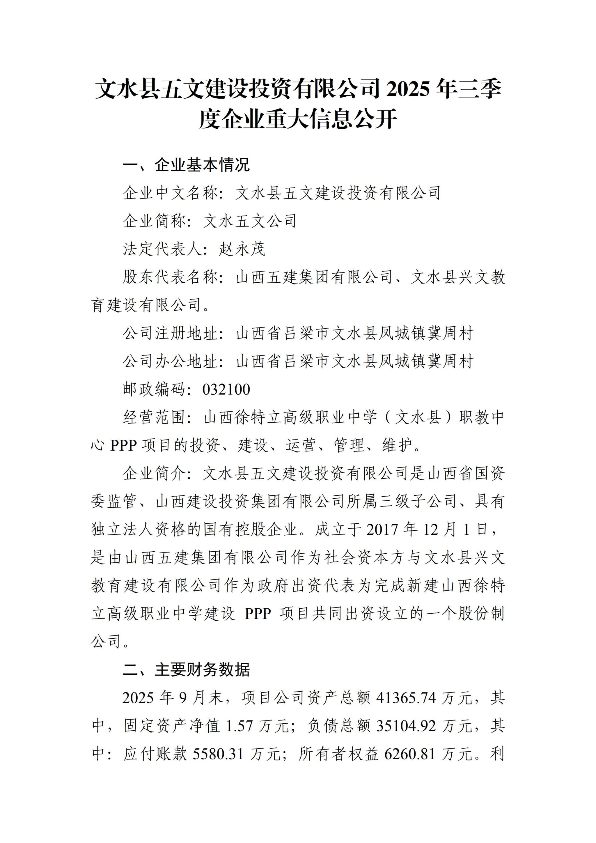 文水县五文建设投资有限公司2025年三季度企业重大信息果真