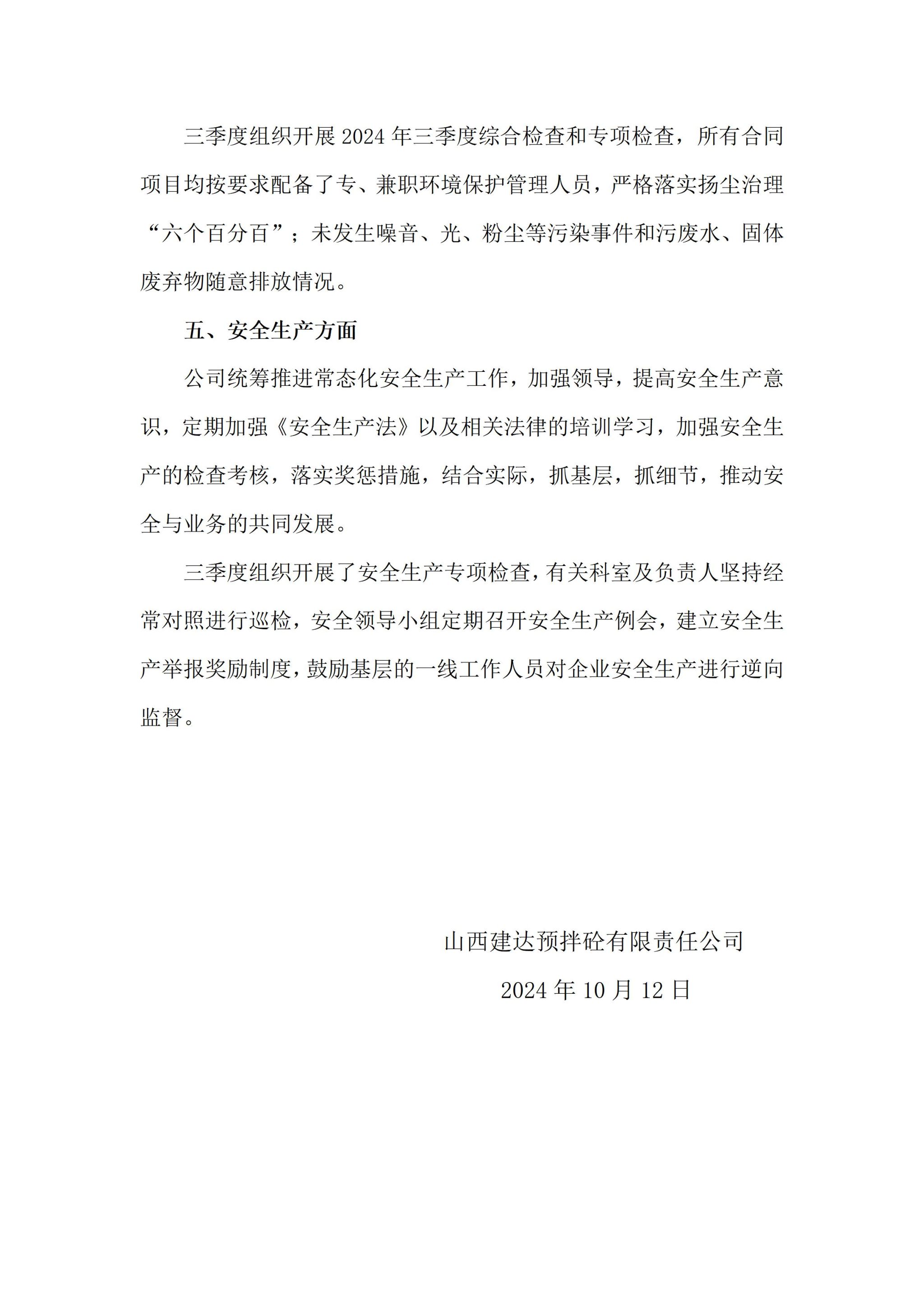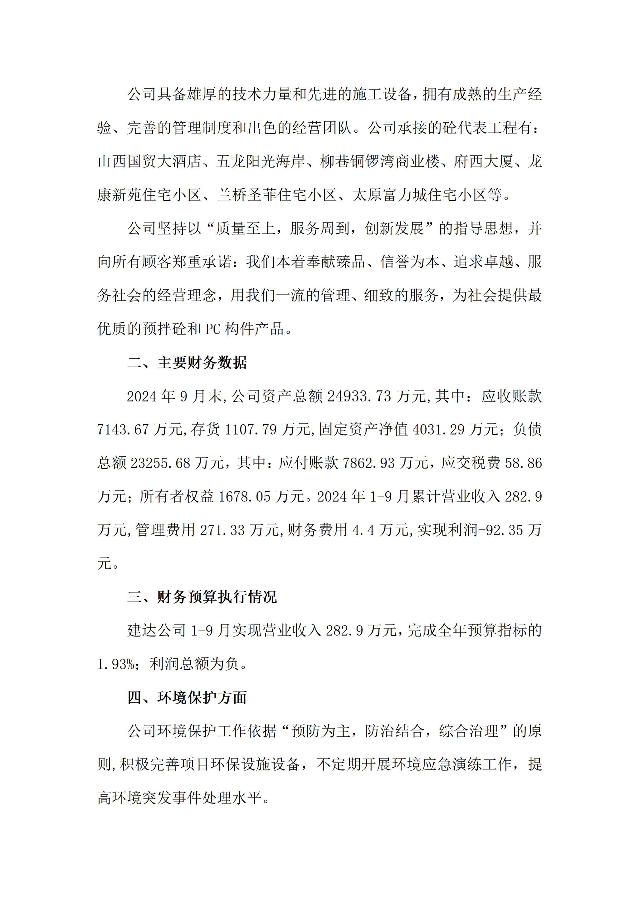 山西建达预拌砼有限责任公司2024年三季度企业重大信息果真